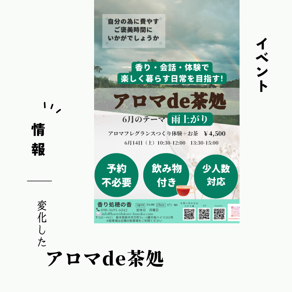 香りで晴れ間を 心に届けるアロマ体験 ー 6月14日限定!天然精油を使ったフレグランスづくり&香りの自由体験タイムー
