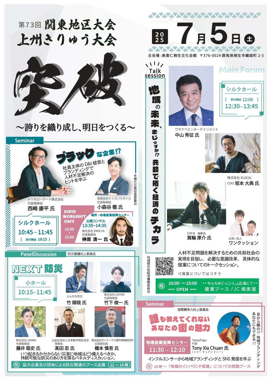 本フォーラムでは、群馬県出身でお茶の間でもおなじみの中山秀征氏(ワタナベエンターテインメント)をはじめ、話題の起業家 坂本大典氏(XLOCAL COO)、箕輪厚介氏(波の上商店 代表)を迎え、地域経済や人材不足、共助社会の可能性について熱く語っていただきます。