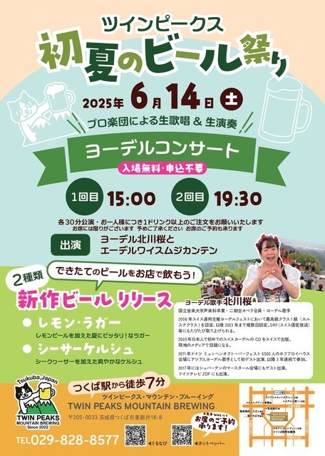 つくばにあるドイツ人ボイクマン・カーステンさん経営のクラフトビール醸造所「Twin Peaks ツィンピークス」で開催される初夏のビール祭り。ヨーデル北川桜とエーデルワイスムジカンテンがドイツのスタイルの演奏で盛り上げるアインプロージット! ドイツの乾杯や、思わす手拍子したくなるような、本場仕込みのドイツヨーデル、シュンケルポロ、ポロネーゼといったドイツのビールのシーンの盛り上がり方でお届け。