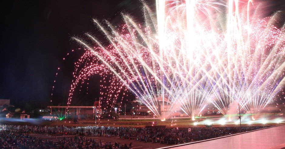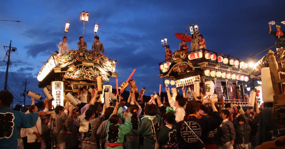 最終日の7月27日(日)は、お囃子が鳴り響く中、かがり火に照らされた本社神輿が幻想的な雰囲気の中で宮入し、祭りのフィナーレを迎えます。特に2日目の花火大会の見どころは、間近で見る花火の迫力です。その花火が打ちあがる中、山車・屋台のぶっつけは最大の見どころで、これらを同時に見られる祭りは他に類を見ません。