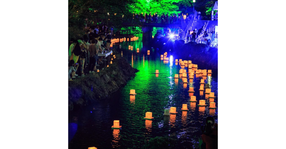 ステージでは「灯ろう流しコンサート」が開催され、心を和ませる演奏を聴きながら、ゆったりと川面を流れる灯ろうと光を楽しむことができ、毎年約4万人の方が来場します。流し灯ろうは、当日会場で購入でき、その場で各々の想いを灯ろうに書くことができ、飲食店の出店もあり、飲食をしながらゆっくりとイベントを楽しむことも可能です。静かで厳かな雰囲気の中で、水面に揺らめく無数の光が心を癒してくれる、美しい夏の夜のイベントです。