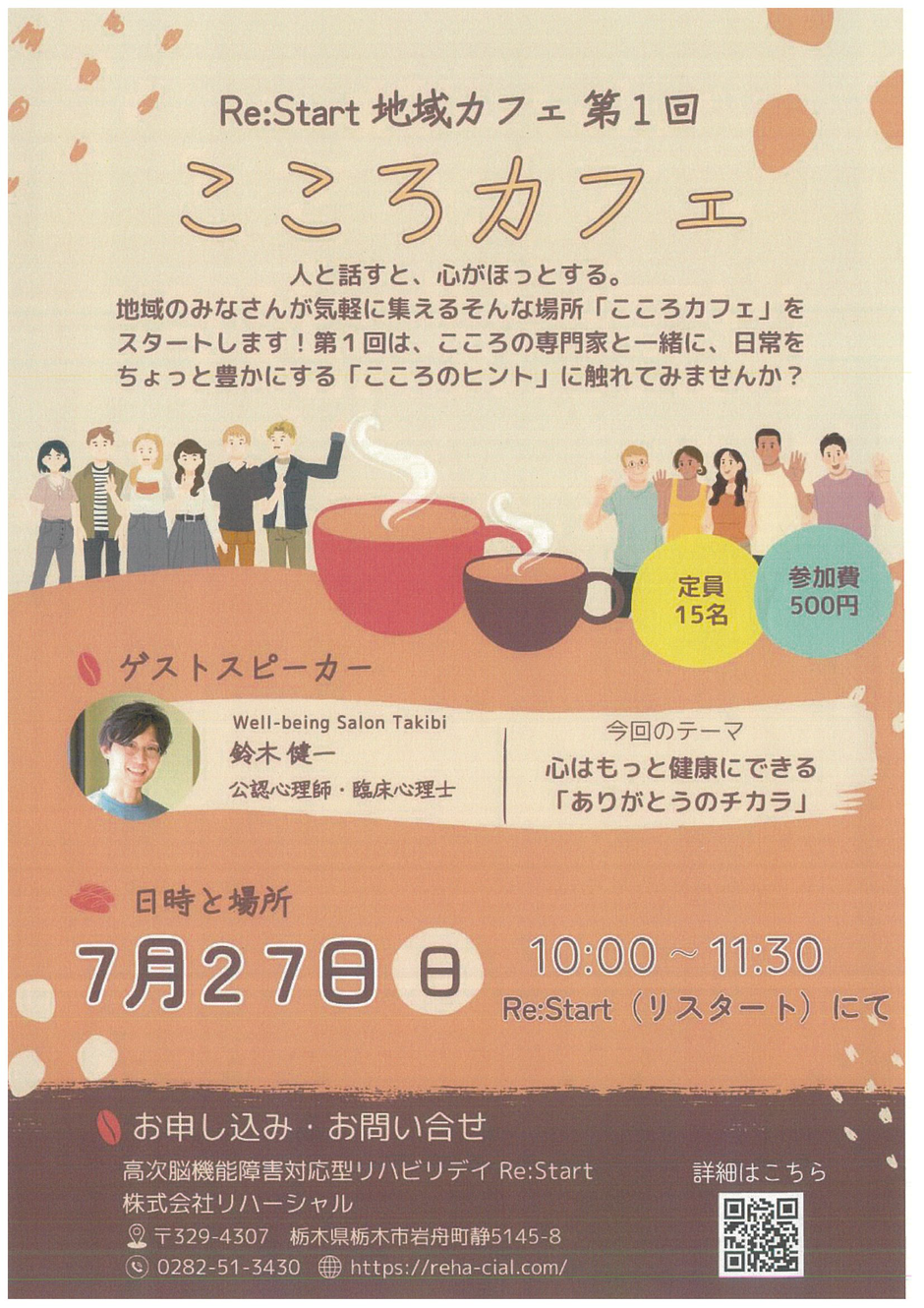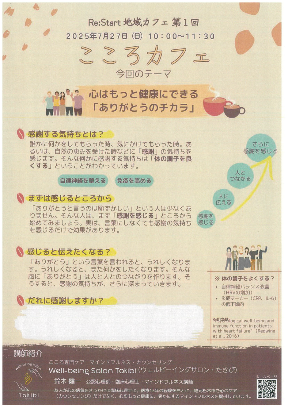 地域のみなさんが気軽に集えるそんな場所「こころかふぇ」をスタートします!第1回は、こころの専門家と一緒に、日常をちょっと豊かにする「こころのヒント」に触れてみませんか?