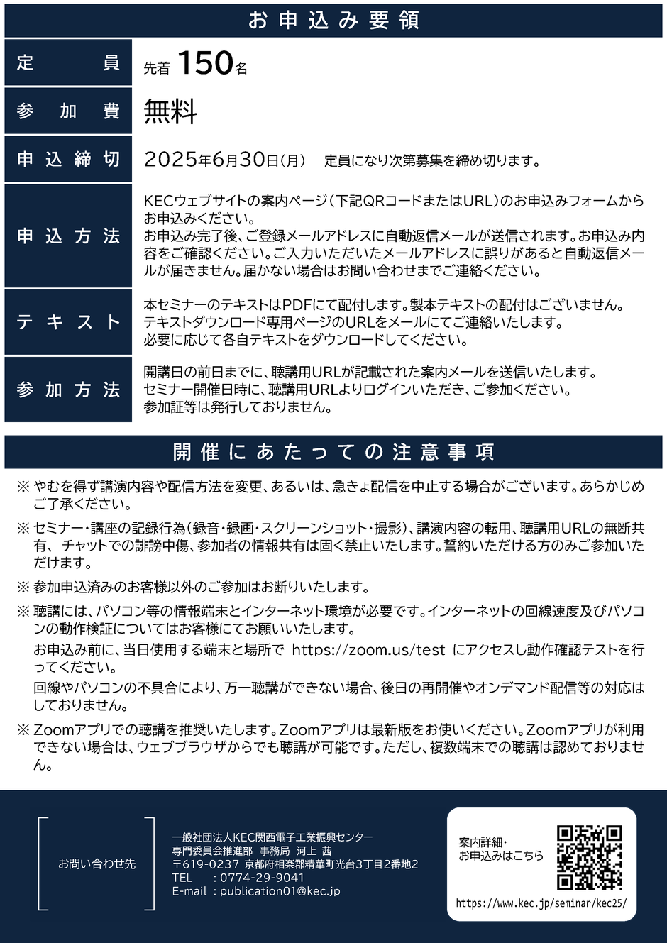 | お問い合わせ | 一般社団法人KEC関西電子工業振興センター 専門委員会推進部 事務局 TEL:0774-29-9041 E-mail:publication01@kec.jp |