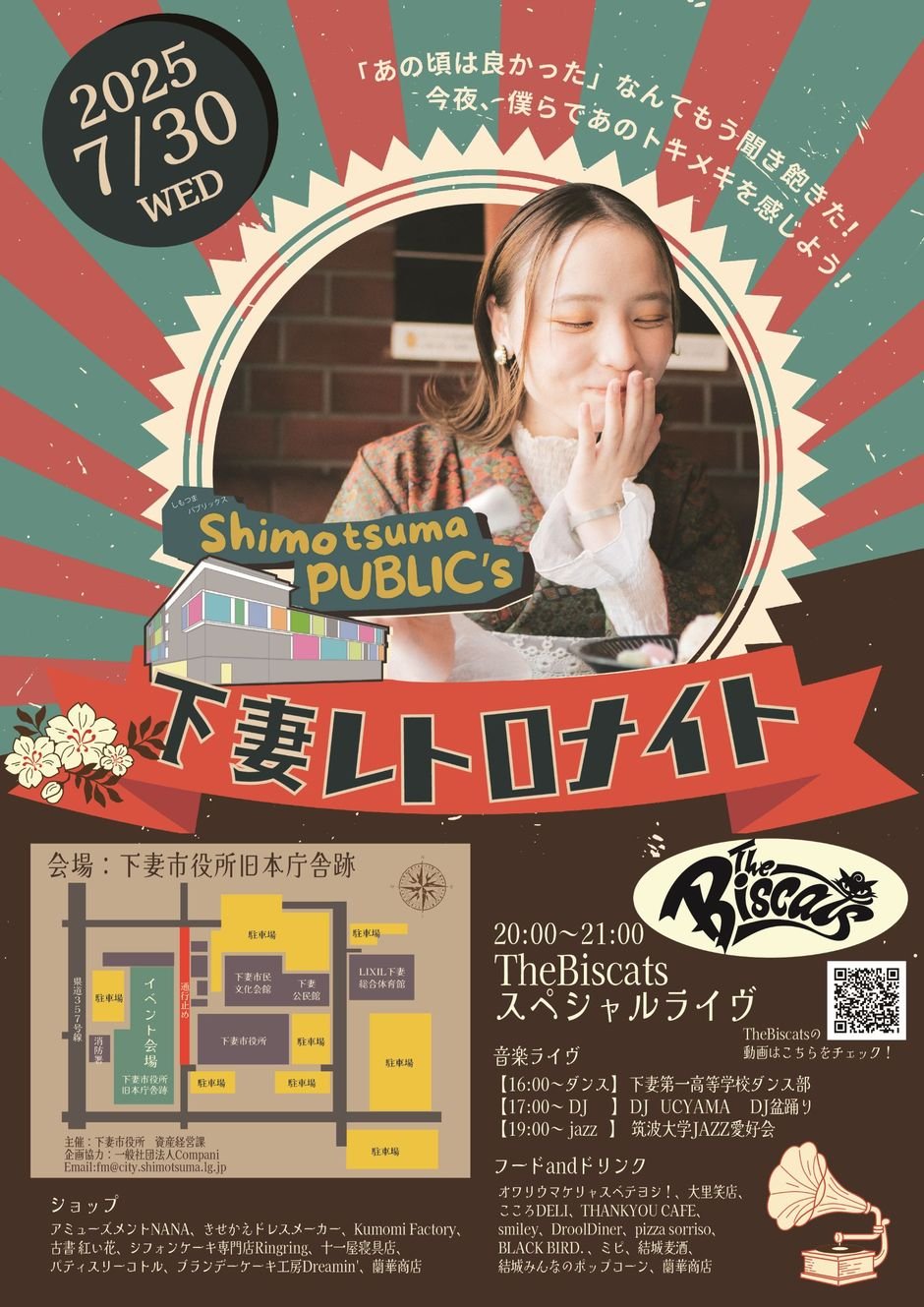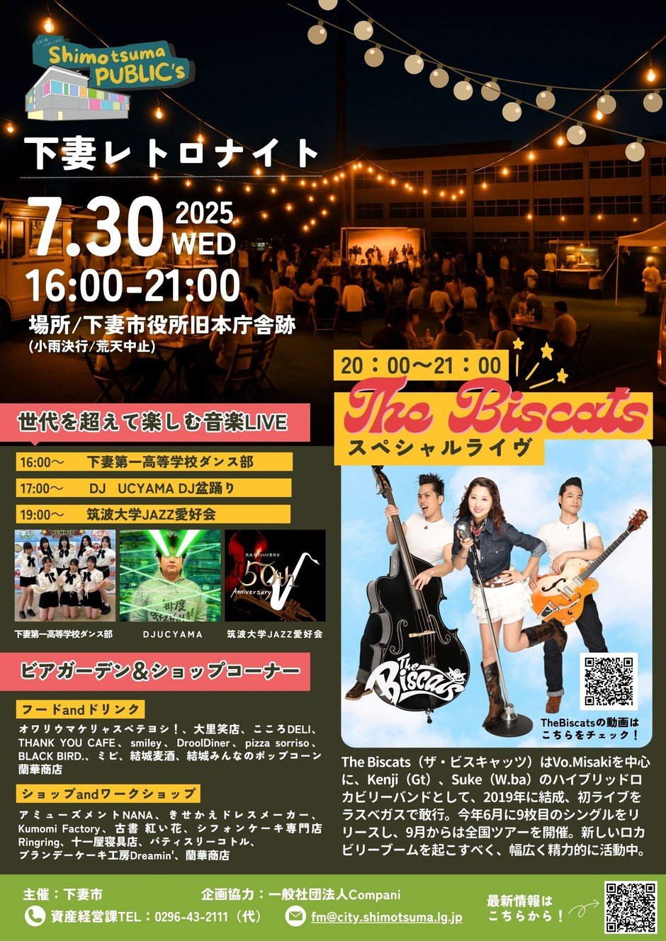 旧庁舎跡地を活用し、飲食店、雑貨店、ワークショップ等が出店し、下妻の夜を明るく盛り上げます。また、地元高校生によるダンスステージや、特別ゲスト「The biscats」による音楽ライブも行います!