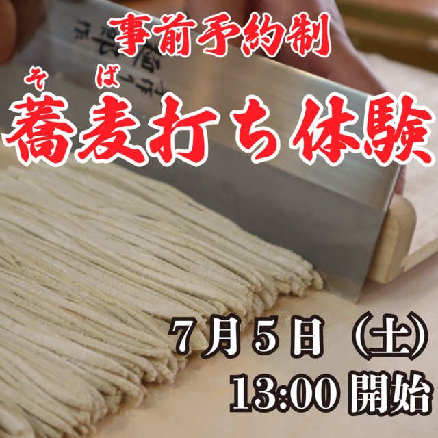 そば粉から自分で捏ねてそば打ちの楽しさ、奥深さを体験してみよう。打ち立てお蕎麦の試食あり!自分で打ったお蕎麦は持ち帰りできる。最低申し込み数2名分から。WEBからの事前予約制。