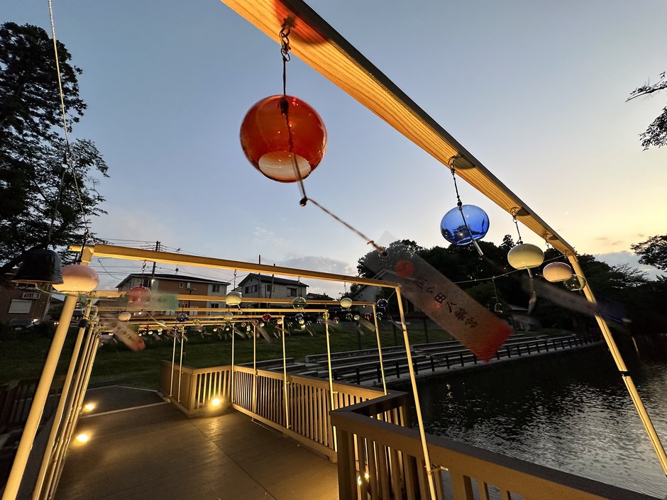 水と緑に溢れた間々田八幡宮の広大な境内に600個を越える風鈴が涼やかな音色を響かせます。使用する風鈴は東京の老舗風鈴店「篠原まるよし風鈴」の手作りの江戸風鈴。色とりどりのガラスの風鈴は目からも耳からも涼を感じることができるでしょう。夜には風鈴のライトアップも実施します(16時30分〜21時頃まで)。