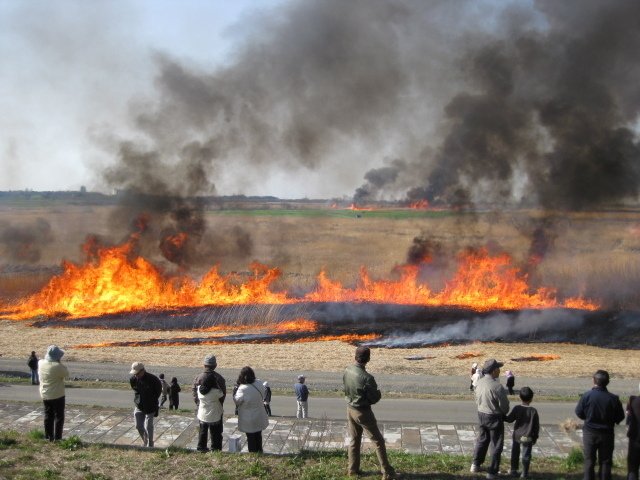 3月の風物詩である渡良瀬遊水地のヨシ焼きが行われる。昭和30年代頃から行われ、その範囲は約1,500haにもおよぶ。枯れたヨシを焼くことで、新たなヨシや多くの植物が芽生え、豊かな湿地環境を保全することができる。