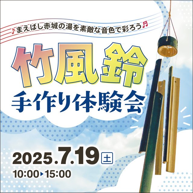 竹を使い、オリジナル竹風鈴を作ろう! 皆さんがつくった風鈴は期間中、まえばし赤城の湯の玄関に展示される。夏休みの思い出に友達と参加してみては? 予約制。参加特典:まえばし赤城の湯で使える100円割引クーポン券