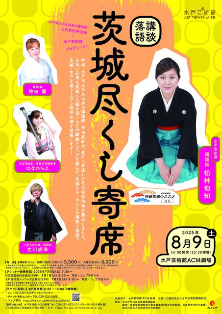 茨城をテーマにした講談と落語で茨城・水戸を盛り上げる寄席。出演は、水戸大使も務める水戸市出身の真打・講談師 松林伯知、松林伯知の姉弟子である真打・講談師 神田蘭、津軽三味線全国大会の2000年チャンピオンである、日立市出身の津軽三味線奏者・はなわちえ、小美玉市出身の落語家・立川成幸、常陸太田市出身の落語家・柳家ひろ馬。