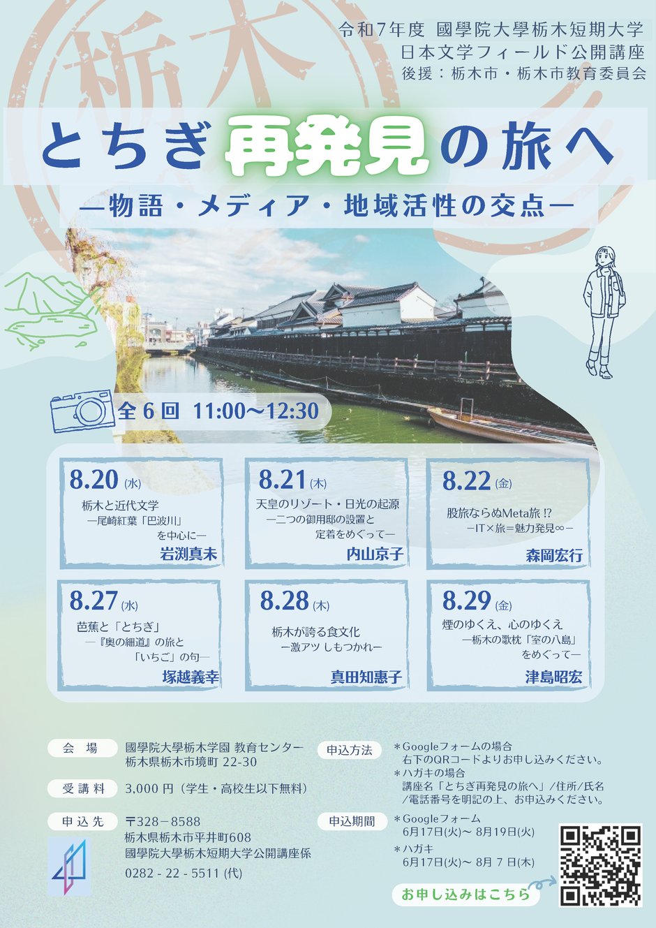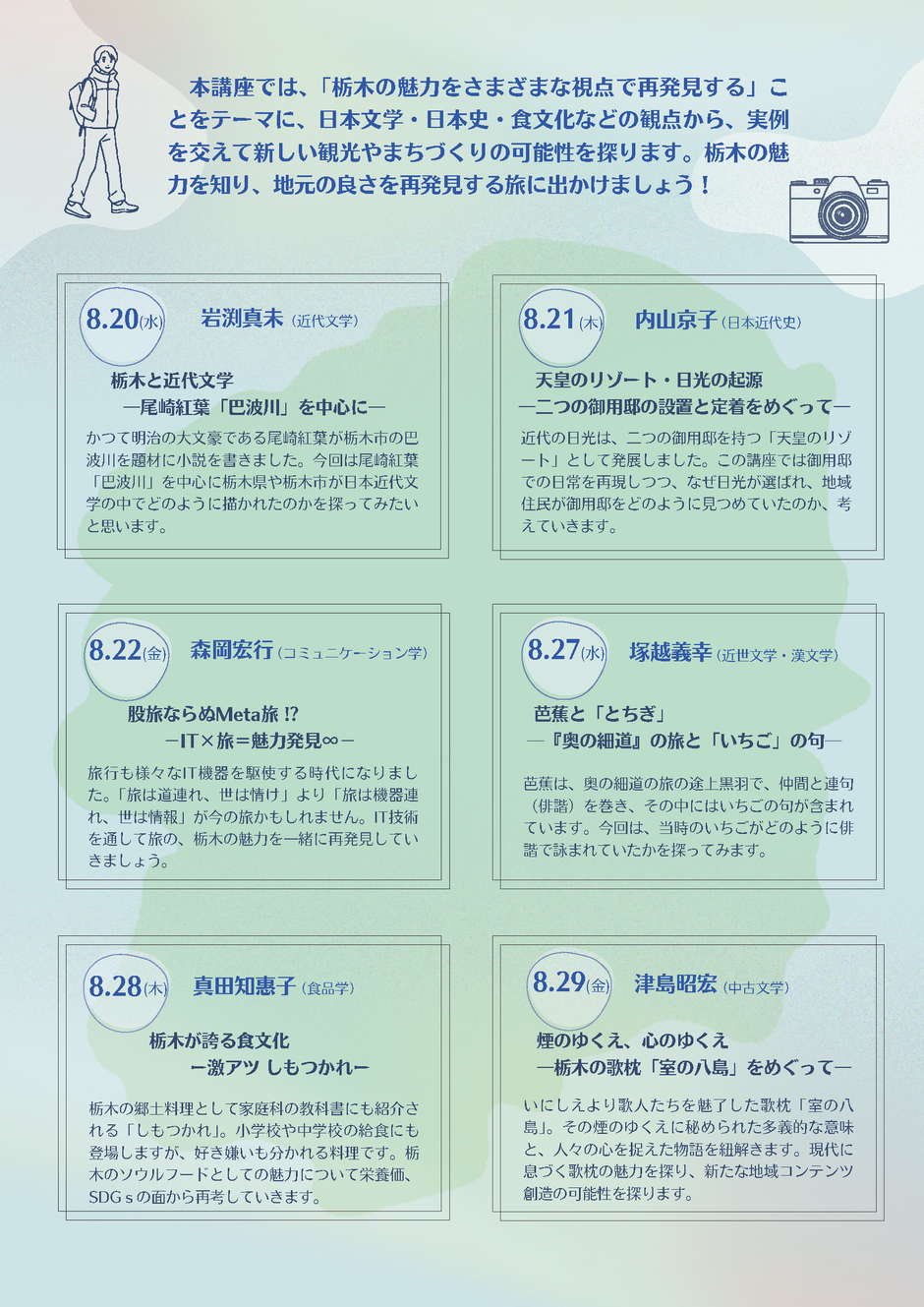本講座では、「栃木の魅力をさまざまな視点で再発見する」ことをテーマに、日本文学・日本史・食文化などの観点から、実例を交えて新しい観光やまちづくりの可能性を探ります。栃木の魅力を知り、地元の良さを再発見する旅に出かけましょう!