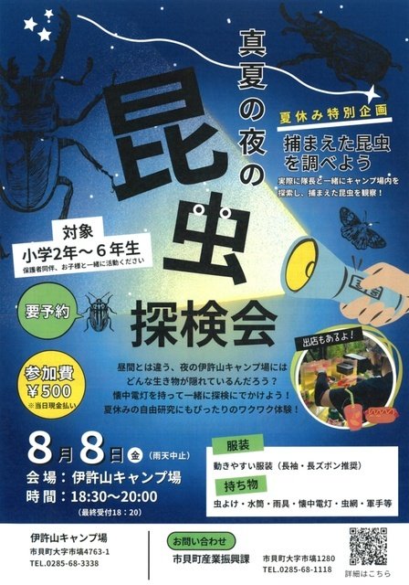 夜の伊許山キャンプ場で、昆虫に詳しい「阿久津隊長」と一緒に懐中電灯を持って探検に出かけよう!樹液のにおいをたどりながら、夜行性の昆虫たち(カブトムシ、コクワガタ、スズメガなど)を探して、捕まえて観察する。夏休みの自由研究にもぴったりの「わくわくドキドキ体験」!フードの出店もある!予約は8月1日まで。市貝町のHPから直接申し込める。※小学2年~6年生対象(保護者同伴)先着30名程度。
