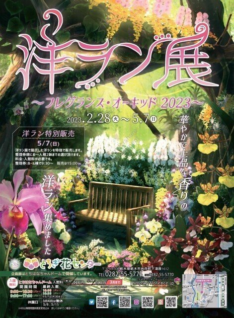 栃木県産のコチョウランやカトレア、シンビジュームを中心に、なかなか見ることのできない珍しい洋ランも含め約100種500鉢の洋ランを展示する。洋ランの優雅な花と魅惑の香りに包まれた空間で、贅沢な春のひとときを過ごそう。