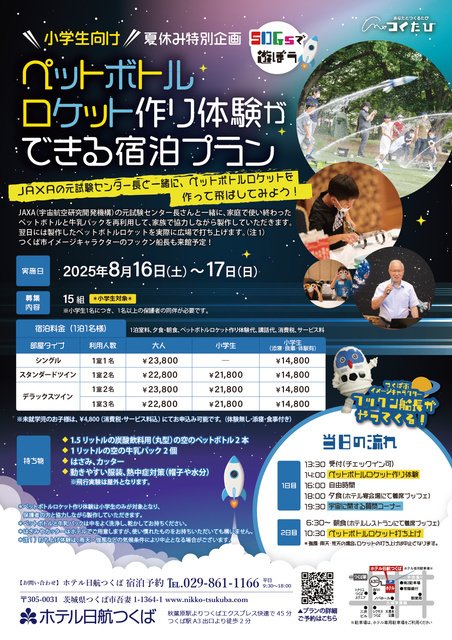 開催日時備考: <1日目>13:30受付/14:00~16:00ペットボトルロケット作り体験/16:00~自由時間/18:00~19:30夕食(ホテルブッフェ)/19:30~宇宙に関する質問コーナー<2日目>6:30~9:00朝食ブッフェ/10:30~12:30ペットボトルロケット打ち上げ実験(場所は徒歩約15分の広場、雨天時中止)