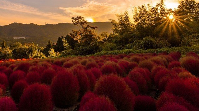 一面の真っ赤なホウキ草(コキア)が美しい