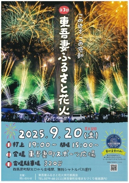 開催日時備考: 15時開場、花火の打ち上げは19時~30分程度。 ※荒天時は翌日に順延。群馬原町駅北口よりスポーツ広場間の無料シャトルバス運行あり。飲食出店情報、ポップコーン、タコライス、かき氷、米粉ベーグル、ジュース類等。17時よりビンゴ大会。