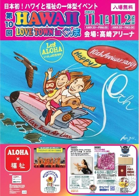 Aloha×福祉「第10回Hawaii Love Town inぐんま」を開催。障がいがあってもなくても皆が同じ場所で一緒にハワイを感じて楽しむイベント。今年は2029年の国体に向けてなパラスポーツ体験を実施。様々な福祉体験をスタンプラリーで回ったり、ステージでは1300人越えフラショーや会場内はキャーシー中島のハワイアンキルト展や全国から集まったハワイアンショップで買い回り抽選会もあり。
