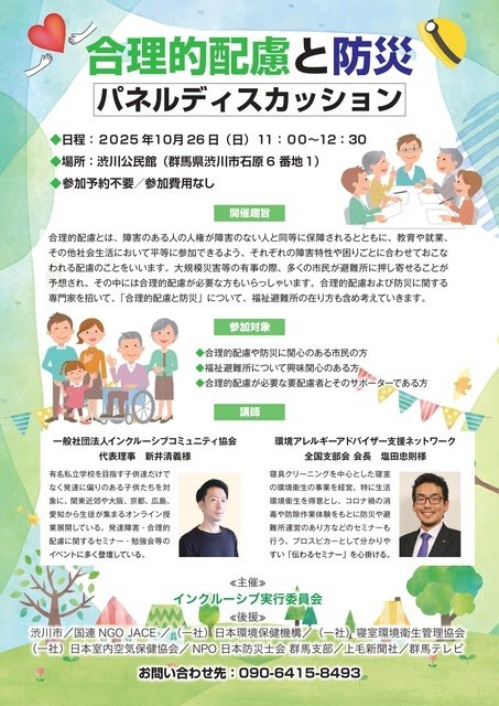 大規模災害等の有事の際、多くの市民が避難所に押し寄せることが予想され、その中には合理的配慮が必要な人もいる。合理的配慮および防災に関する専門家を招いて、「合理的配慮と防災」について、福祉避難所の在り方も含め考えてみよう。