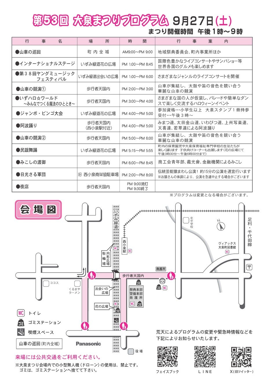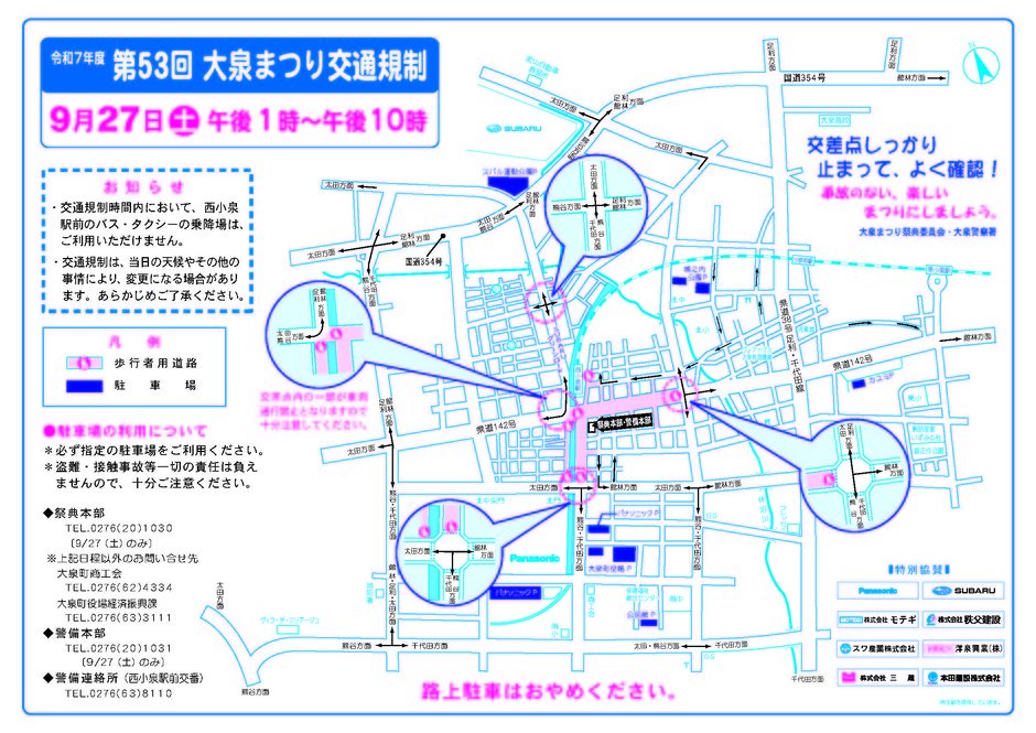 | お問い合わせ | まつり当日の問い合わせ先 ・祭典本部:0276-20-1030 ・警備本部:0276-20-1031 ・警備連絡所(西小泉駅前交番):0276-63-8110 |