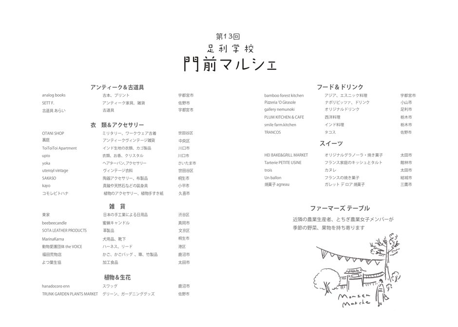 | お問い合わせ | 主催: 門前マルシェ実行委員会 tel.0284-20-2264 ( 足利市観光まちづくり課) 運営:NPO 法人 日本マーケット プロジェクト(the J.M.P.) |