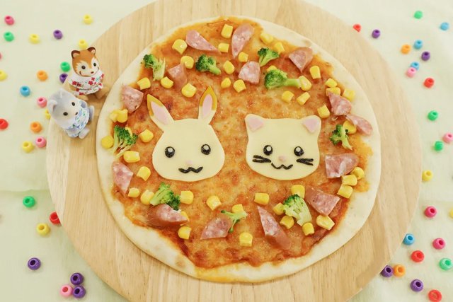 もちもちのタピオカ入り生地を好きな形に伸ばしたら、選んだ具材をトッピング!誰でも簡単にオリジナルのピザができる(トッピングは都合により変更となる場合あり)。※見本写真のお顔チーズは、別料金での追加トッピング。※焼き上がりに約10分の時間がかかる。