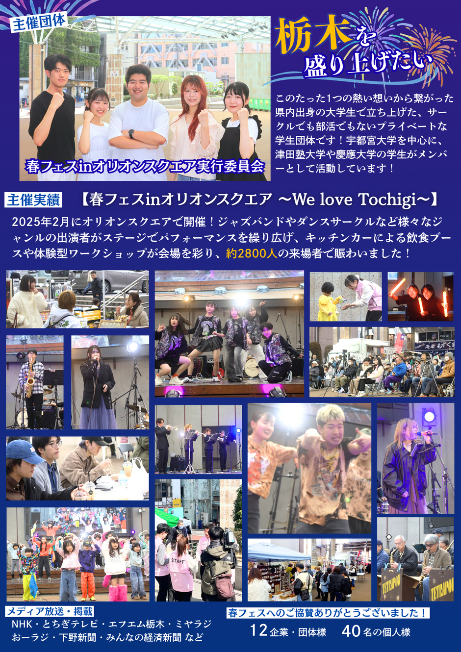 栃木を盛り上げたい!というたった1つの共通点から繋がった大学生5人がゼロから企画しました!今年2月には「春フェスinオリオンスクエア~We love Tochigi~」を主催し、約2800人の方々にご来場いただきました!春フェスは日曜開催だったため、ステージライブなどファミリー向けの内容でしたが、今回はいわゆる「華金」お仕事帰りや学校帰りの学生をターゲットにします!キッチンカーやフードテントなど栃木を拠点とする飲食ブース11店舗が大集結しておりますので、ぜひお越しください!