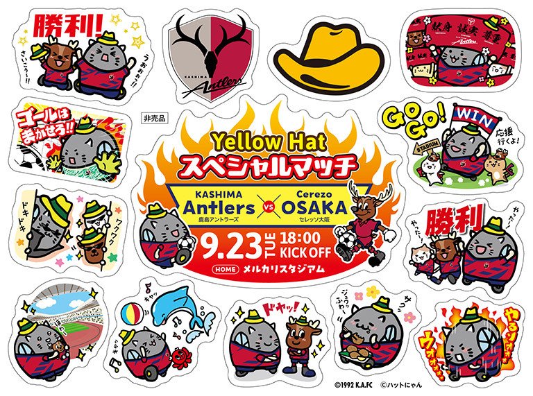 「イエローハット スペシャルマッチ」開催を記念して、試合当日に実施する来場者プレゼント企画「鹿BIG」とオンラインプレゼント企画「どこでも鹿BIG」に「イエローハット賞」が登場します。「鹿BIG」では恒例の「ユニフォーム着用ハットにゃん」のぬいぐるみに、スペシャルバージョンの「秋の全国交通安全運動 ハットにゃん」のぬいぐるみを加えた2匹セットをプレゼント。「どこでも鹿BIG」では、イエローハットハットトリック賞でおなじみのテンガロンハットが賞品となります。