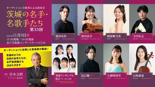 茨城県にゆかりのある優れた演奏家を発掘・紹介する、オーディション式の演奏会。今年6月に行われたオーディションに合格した8組の音楽家が集結!司会は音楽家・宮本文昭。出演は榎田有玖(ピアノ)、和田涼音(ヴァイオリン)、園部帆乃香(ピアノ)、寺内弘志(オルガン)、邦楽アンサンブル彩音(箏・三絃 五重奏)、辰巳健一(ピアノ)、古橋明香里(ピアノ)、石坂淑恵(ヴィオラ)、ほか。