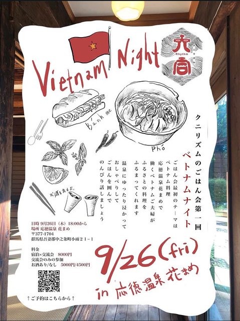 日本で最も美しい村連合に加盟する六合村。豊かな自然に囲まれて、美味しいお料理と温泉が楽しめる。花まめの料理人が作る本格ベトナム料理に加え、今回は六合村の良さを広く知ってもらう為参加者との交流会も企画。なお、お得な宿泊プランも用意しているので、お酒を飲んでそのまま泊まることも可能。