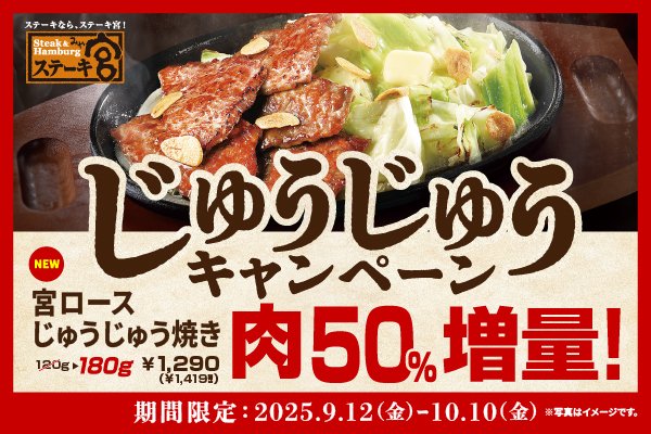 コロワイドグループの株式会社アトム(本社:神奈川県横浜市、代表取締役社長:植田剛史)が展開するステーキ宮では、7月30日(水)のグランドメニュー変更で新登場した「宮ロースじゅうじゅう焼き」の4万食突破を記念したキャンペーンを実施します。