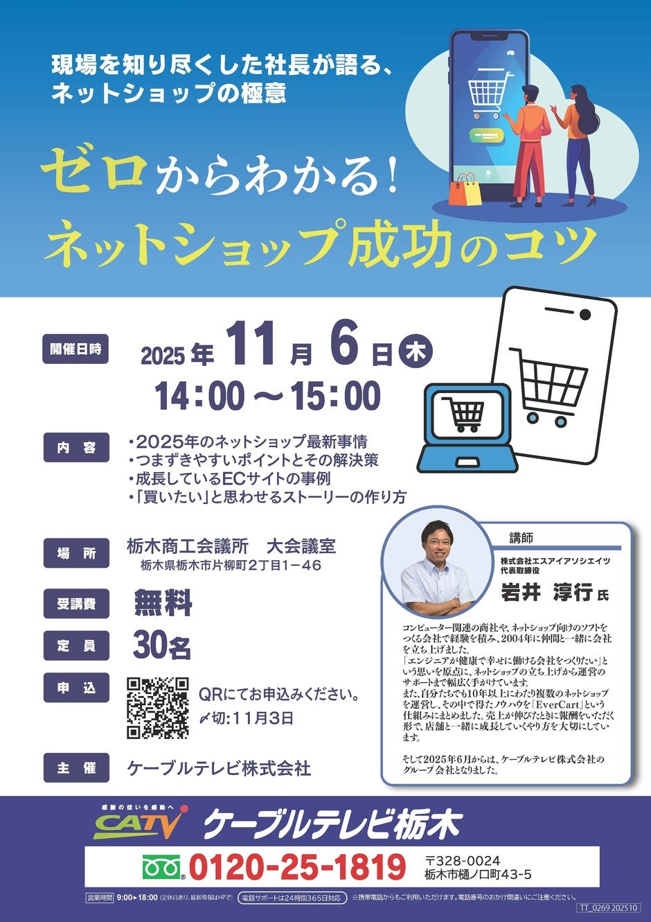 ネットショップを始めようか迷っている方、運営に悩んでいる方ぜひお越しください。10年以上ネットショップを立ち上げから運用までしている社長のお話を聞くことができます。