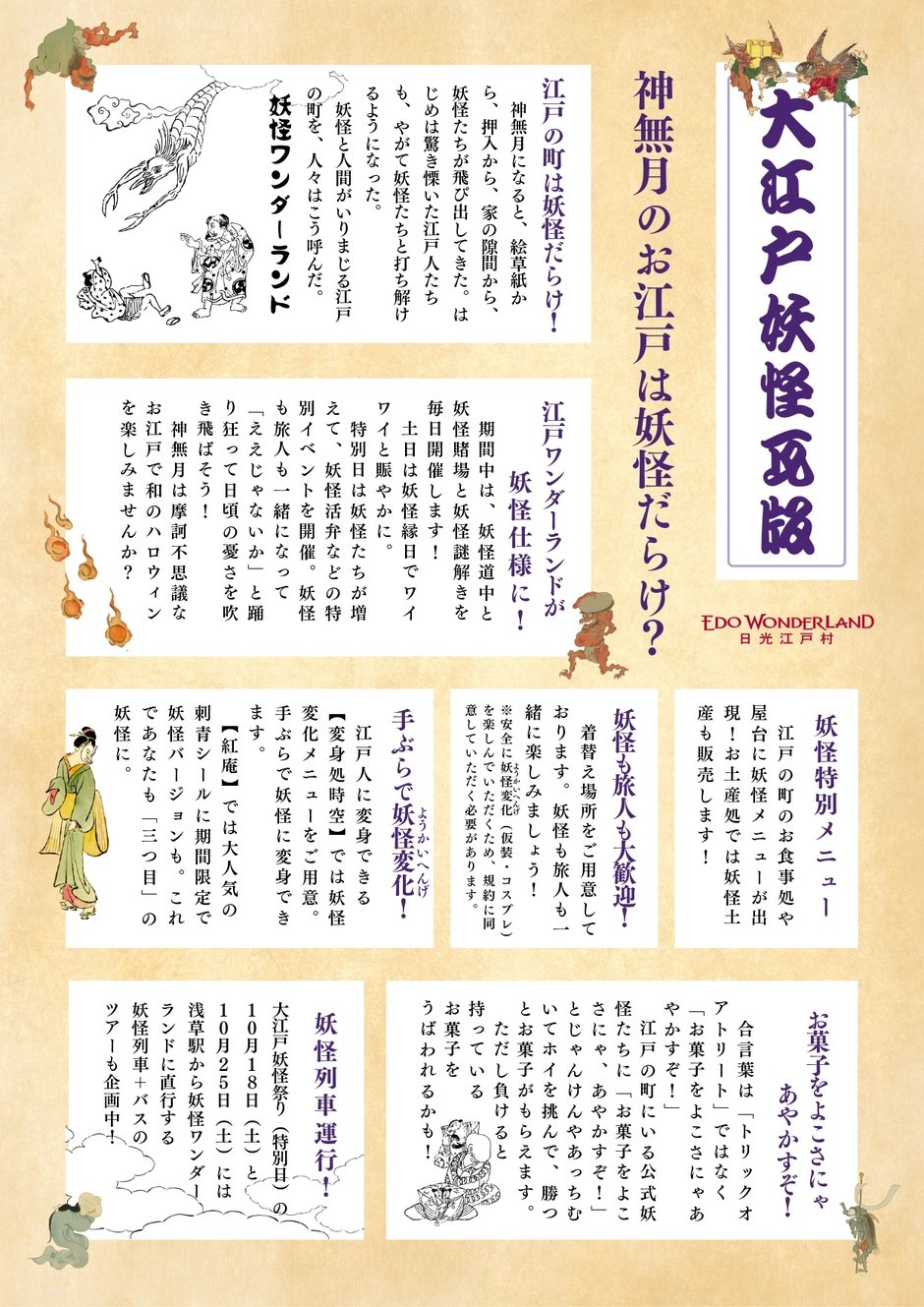 驚きとともに始まる、不思議で愉快な秋の物語。江戸ワンダーランドが、妖怪たちの遊び場「妖怪ワンダーランド」に変貌します!