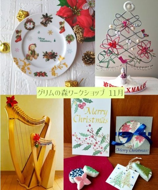| 参加費 | クリスマスプレート1,500円、ワイヤークラフト2,800円、消しゴムはんことカリグラフィー2,500円、ミニハープ体験500円、ミニハープコンサート500円 |