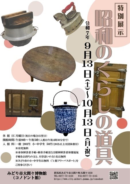 大間々博物館では、令和4年度からミニ企画として「小さな昔のくらし展」を開催している。今年は昭和100年目にあたることから、同館所蔵の資料の中でも昭和期に使用された生活道具を展示する。この100年間で人々の生活様式は劇的な変化を遂げた。今展を通じて昔と今の暮らしを比較したり、当時の暮らしを想像したりすることで、古き懐かしき昭和時代へ思いを馳せる機会になればとの想いで催行される。