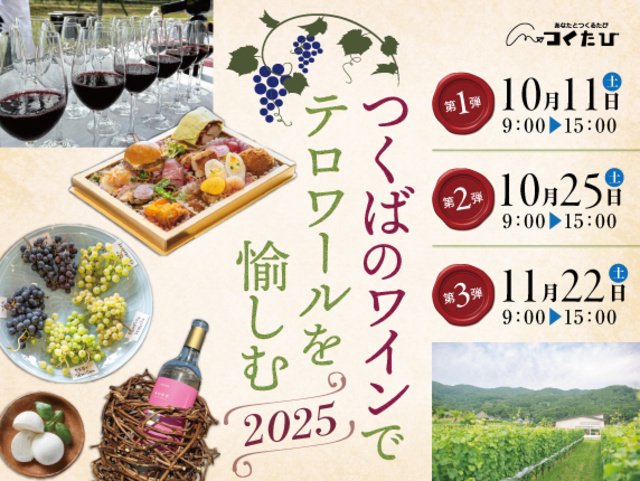 つくば市内のワイナリーとコラボした企画。3つのワイナリーや地元の味覚を愉しむ、体験型ワインイベント。10/11(土)つくばワイナリー:ワイナリー見学&手作りモッツァレラチーズ作り&稲葉酒造見学/10/25(土)Bee’s Knees Vineyards:つくばジオミュージアム&発酵途中のワインの試飲/11/22(土)Tsukuba Vinyard:生演奏&ワイン籠作り&筑波ハム見学