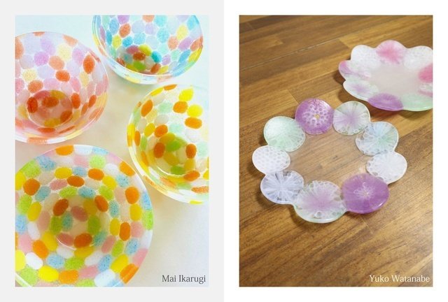 怒木麻衣さんは粉からガラス板を作り出すパウダーフュージング技法で制作。ゼリービーンズなどのポップな色合いのカラフルな皿などを制作。渡辺ゆう子さんはムリーニワーク(金太郎飴のようなパーツを作る技法)でパーツを作成して花模様のお皿や、水彩画のようなグラスや花器を制作。
