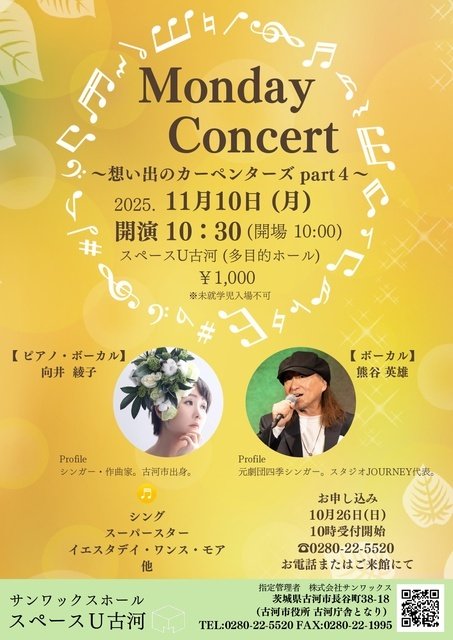 熊谷英雄さん(元劇団四季シンガー)、向井綾子さんによるピアノと歌で送るカーペンターズの名曲の数々を楽しもう。曲目:スーパースター、シング、イエスタデイ・ワンス・モア他。10月26日(日) 10時より受付開始。来館申込または電話にて。 ※未就学児入場不可