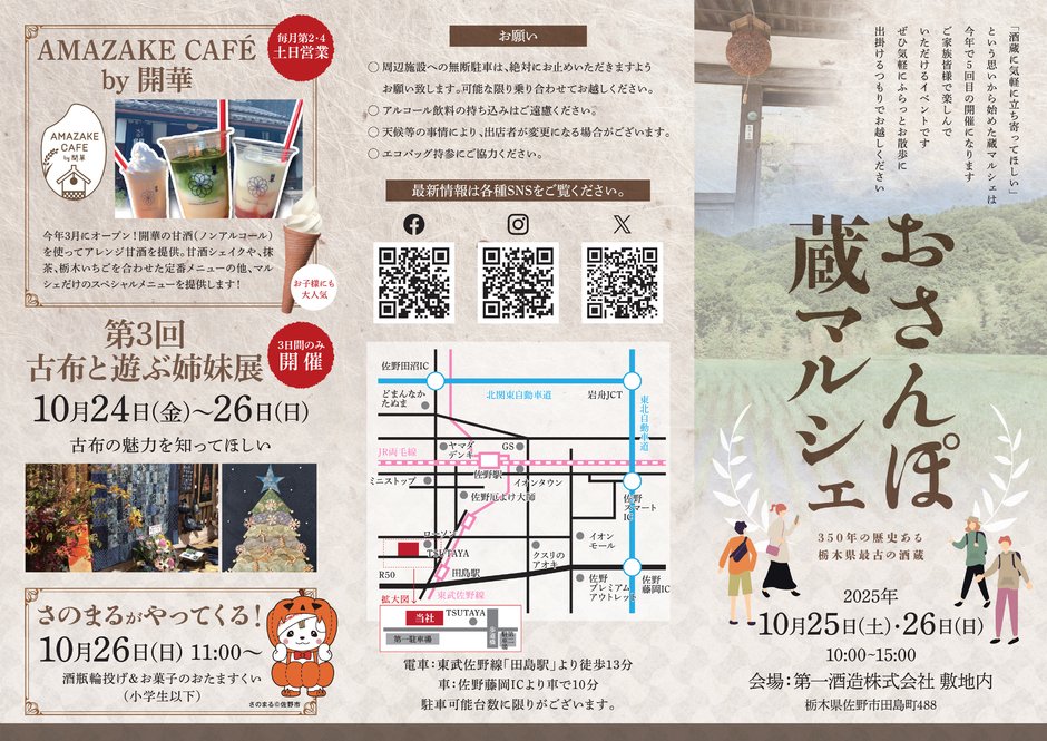 会場では、ノンアルコールの麹甘酒を使った人気商品「甘酒ソフトクリーム」をはじめ、地元生産者による新鮮な野菜やスイーツ、手作り雑貨、ワークショップなど、多彩なブースが並びます。また、毎月開催している日本酒の量り売り販売、日本酒カクテルや限定酒が楽しめる「開華 角打ち」、酒蔵スタッフが講師を務める「日本酒講座(要予約)」など、酒蔵ならではの特別な体験もご用意しています。お子様連れでも楽しめる企画や、初めての方でも気軽に参加できる内容となっており、地域の皆さまはもちろん、観光で訪れた方にもご満足いただけるイベントです。