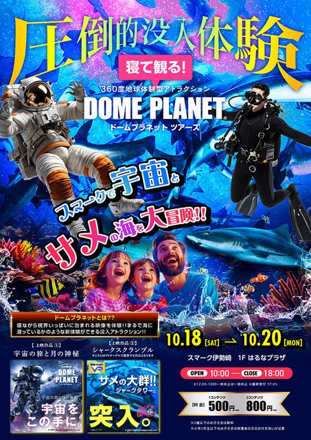 最新の3D360度VRが体験できる『イマーシブアクアリウム』と、エアドームの中で全天周360度の映像体験ができる『ドームプラネット』、2つの没入体験を組み合わせた、まるでその場にいるかのような映像体験ができる没入体験イベントを開催。イマーシブアクアリウムでは「シャークスクランブル」を、ドームプラネットでは「宇宙の旅と月の神秘」と「イルカ・ジンベエザメと泳ぐ世界の海」を交互に上映する。