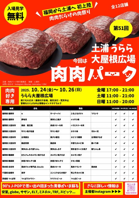 人気店、市外県外から全12店舗が集まる「肉肉だらけの肉祭り 肉肉パーク」が、うらら大屋根広場で初開催。みんな大好き、お肉料理が大集合!各店が自慢のお肉料理を提供。中には肉肉パーク限定メニューも。