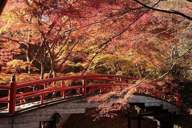 伊香保温泉の湯元付近にある「河鹿橋」は、春には新緑が、秋には紅葉が楽しめる名所となっている。紅葉の時期に併せてライトアップを実施。日中と夜とで雰囲気が大きく変わる紅葉を楽しもう。