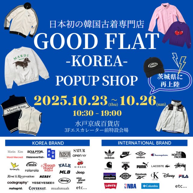 韓国現地でしか手に入らないレアブランドから、日本ではまだ流通の少ない注目ブランドまで、日本の最新ファッショントレンドと掛け合わせた、日本初の韓国古着専門店『GOODFLAT-KOREA-』 が、水戸京成百貨店に4日間限定で登場! 開催期間中はユニセックスアイテムを中心に新作商品を随時追加。性別・世代問わず、訪れるたびに新しい出会いが楽しめる空間を提供する。