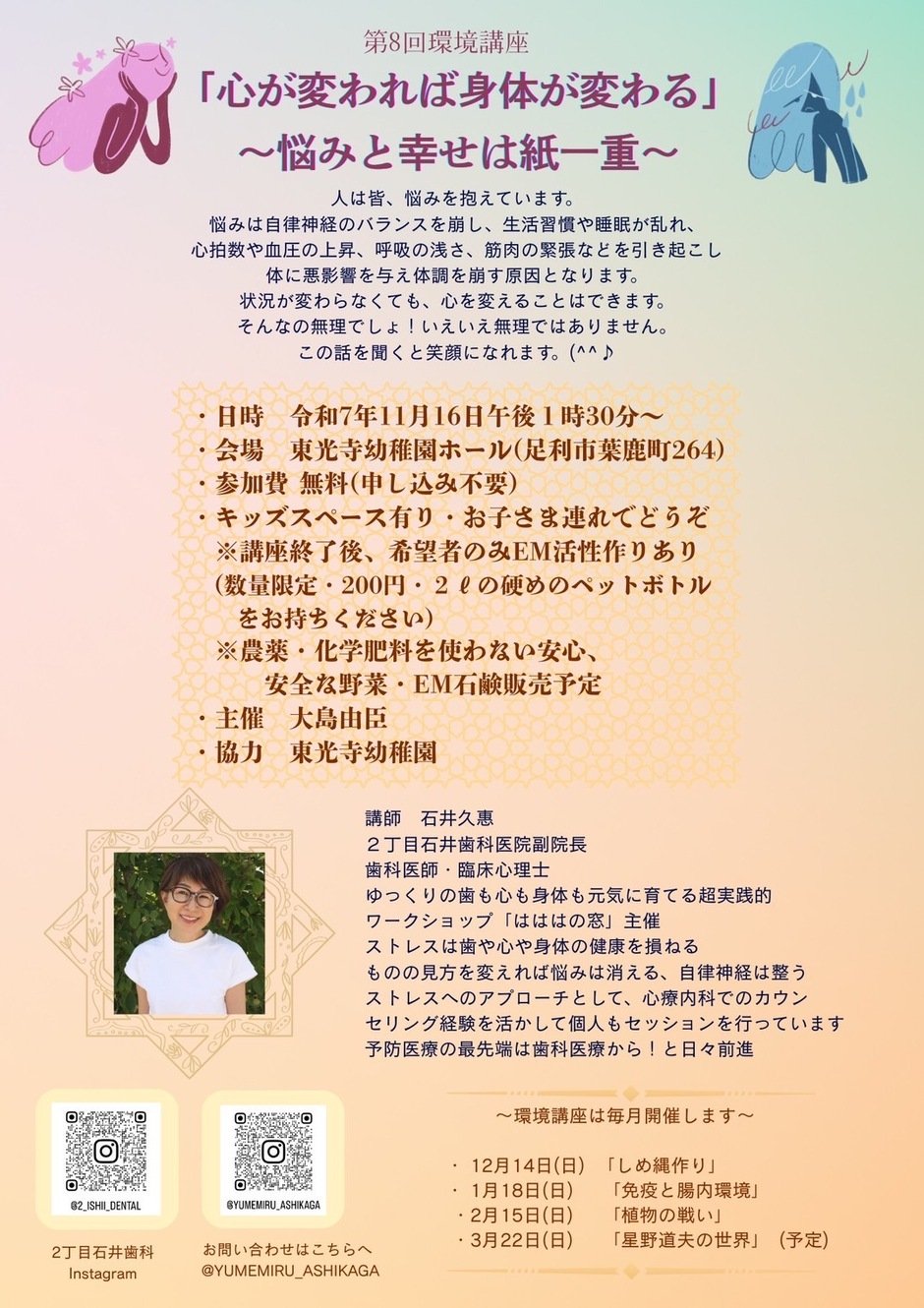 今回の環境講座は講師に石井久恵さんをお迎えし、「心が変われば身体が変わる」〜悩みと幸せは紙一重〜講演会を開催します!
