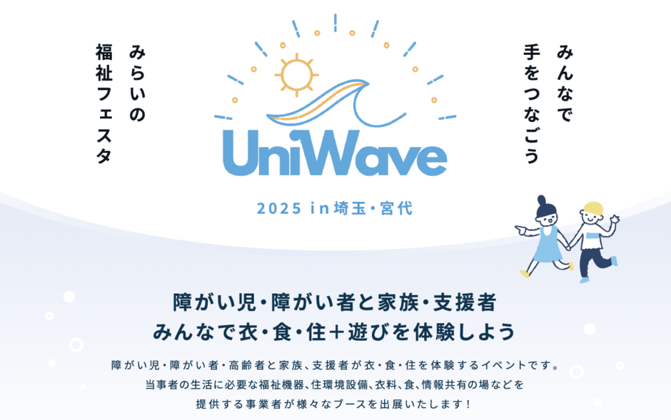 誰一人取り残さない共生社会の実現を目指し、障がい児・者、医療的ケア児・者、高齢者とその家族、そして支援者が一堂に会する体験型福祉イベント「みんなで手をつなごう 未来の福祉フェスタ UniWave 2025 in 埼玉・宮代」が、2025年11月8日(土)・9日(日)の2日間、日本工業大学5号館(埼玉県南埼玉郡宮代町)で開催されます。