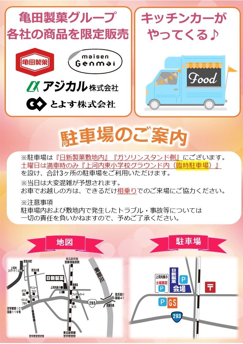 ※駐車場は『日新製菓敷地内』『ガソリンスタンド側』にございます。