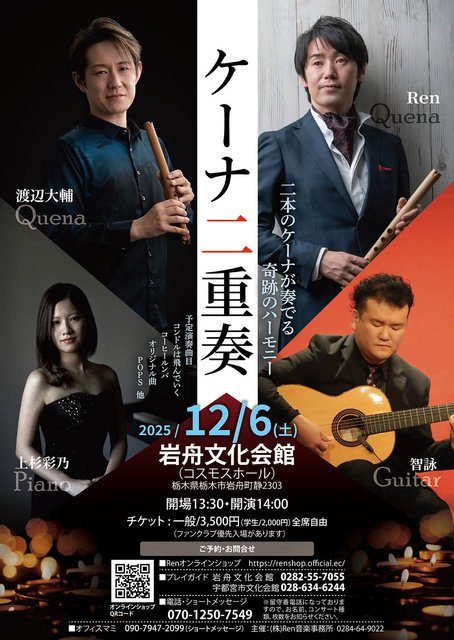 ケーナ奏者:Renと渡辺大輔の織り成す美しいケーナの二重奏を楽しもう!南米の曲、POPS、オリジナル曲など極上体験間違いなし!【共演】ピアノ:上杉彩乃、ギター:智詠