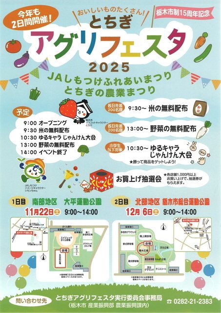 栃木市制15周年記念「とちぎ アグリフェスタ2025」開催。1日目は11月22日に大平運動公園にて、2日目は12月6日に栃木市総合運動公園にて開催される。おいしいものがたくさん大集合。ゆるキャラじゃんけん大会も見逃せない!