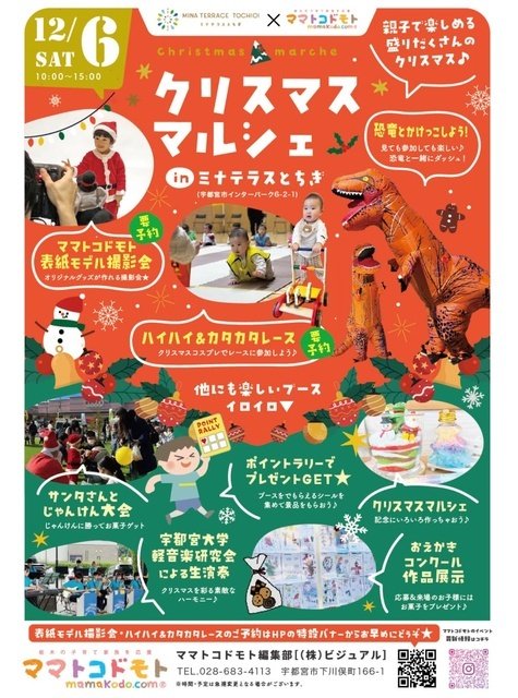 ミナテラスとちぎで親子で楽しめる盛りだくさんのクリスマスマルシェが開催。会場ではママモトコドモト 表紙モデル撮影会、オリジナルグッズが作れる撮影会(要予約)や、恐竜とかけっこしよう!、サンタさんとじゃんけん大会など、参加型のイベントが盛りだくさん。マルシェの出店ではスイーツやカフェなどのほか、雑貨やワークショップも充実。他にも楽しいブースがいろいろ!親子でぜひ出かけよう。