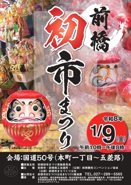 約400年の歴史を誇り、前橋市を代表する伝統文化である前橋初市まつりを後世に継承するとともに、まつりを通じて地域の活性化を図ることで、産業の振興に寄与することを目的として開催。「古だるまお焚き上げ」や「渡御の儀」、福だるま等の縁起物や食べ物の露店出店が行われる。交通規制は9時~22時。無料おまつりバスの運行・臨時タクシー乗場の設置中止。交通規制により路線バス及びマイバスの運行経路・時間が一部変更。