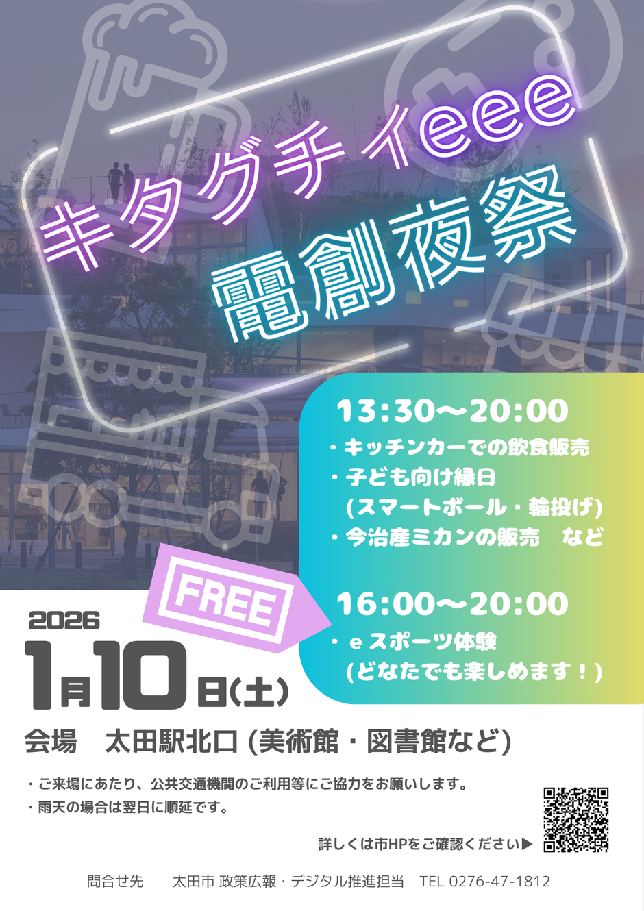 令和8年1月10日(土)に太田市美術館・図書館で「キタグチィeee電創夜祭」が開催されます。縁日やキッチンカー、今治産ミカンの販売、屋内での缶バッチづくりなど多彩な企画が並び、子どもから大人まで楽しめる内容となっています。さらに、目玉企画としてeスポーツイベント(午後4時から午後8時まで)を開催します。なんとeスポーツを屋外で開催!誰でもその場で参加可能!巨大な壁に映し出される大迫力の映像は、初心者から上級者まで満足できることはもちろん、観戦するだけでも十分に楽しめます!入場料は無料。是非お気軽にお越しください!