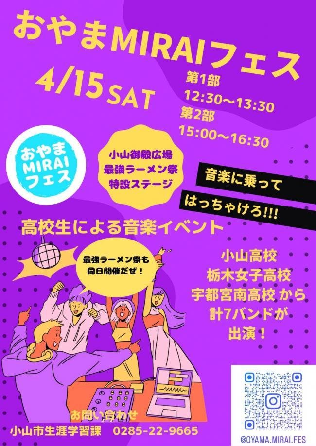 小山御殿広場で開催される「大つけ麺博presents帰ってきた最強ラーメン祭」特設ステージで、4月15日(土)に高校生バンド祭「おやまMIRAIフェス」開催!